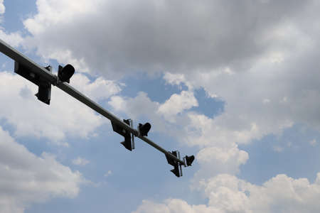 Traffic signal light with red color of cross sign on blue sky and white clouds background. Wrong sign. No entry traffic sign. Red cross guidance stop go traffic signal light. Warning traffic light.