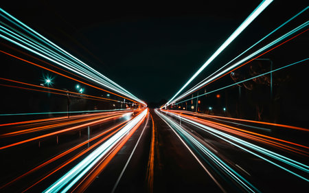 Busy highway at night with long exposure light trails from vehicles, capturing the dynamic energy of urban transportation and movement