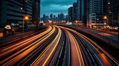 Captivating long exposure photograph capturing vibrant light trails of traffic on an urban highway at night, showcasing movement and energy in city life.