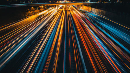 Stunning aerial view showcasing a complex highway interchange illuminated by vibrant light trails. The image captures the energy and motion of urban life.