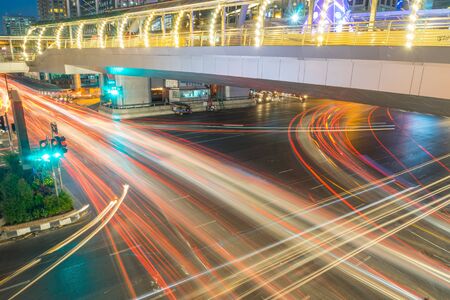 evening crossroad with varicolored lines of lights of cars. abstraction