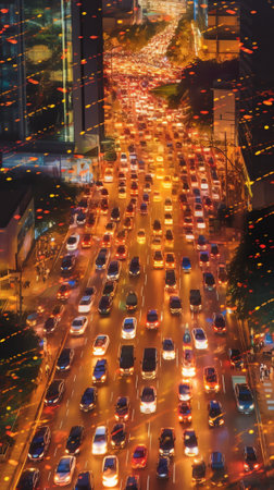the bustling chaos of a rush-hour traffic jam, where countless cars navigate congested roads, the hectic energy of urban life