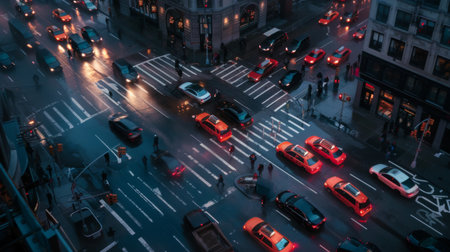 An intersection with cars moving in different directions, traffic lights, and pedestrian crossings, showing the organized chaos of city traffic.