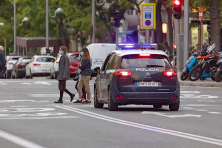 Madrid, Spain - May 16, 2020: A national police car patrolling Narvaez street during the state of alarm and the quarantine de-escalation.