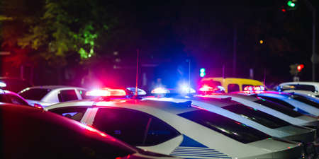 Police cars at night. Police car chasing a car at night with fog background. 911 Emergency response police car speeding to scene of crime. Selective focus