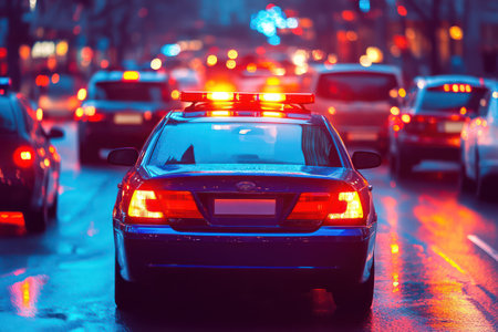 A police car drives through a busy street, lights flashing, amid hectic traffic, symbolizing urgency and city law enforcement.