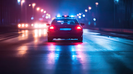 Vibrant red and blue lights flash atop a sleek police vehicle, reflecting urgency as it stands poised at night, ready for any call. Ideal for custom banners.