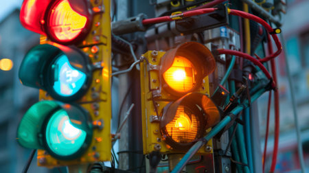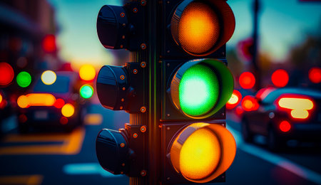 A close-up view presents a traffic signal displaying red, green, and yellow lights. The colors of the lights contrast against a blurred city background. The image exhibits high contrast and bokeh effects. Suitable for illustrating transportation, urban infrastructure, or safety concepts for various purposes.