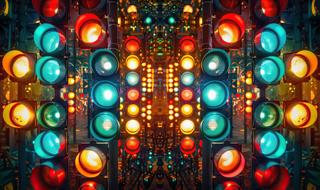 A charming image of a row of traffic lights on a busy street, showcasing their colorful signals and the rhythm of city life in motion