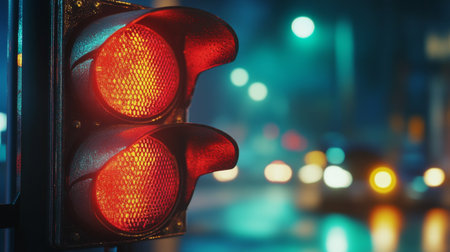 A vibrant red traffic light shines brightly in an urban setting, signaling vehicles to stop. The image captures the essence of city life during the evening, showcasing a safe and illuminated street environment.
