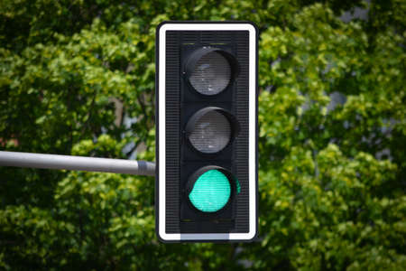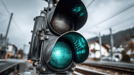 A close-up shot presents a traffic signal with a prominent green light. The image showcases the object's metallic texture, with selective focus on the glowing light. The composition highlights the signal's shape and design, in a day setting. This image could be used in various commercial or editorial applications.