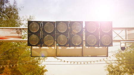 Traffic light under the bridge with red, yellow and green colors. Safety regulations. Traffic light in the city closeup.