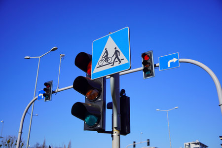 A close-up of traffic signs and signals at a busy intersection, illustrating traffic management in the city.