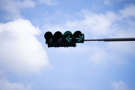 Traffic light at twilight.Sky is orange.Dark powerlines with rim light.You can change some red or green light arrow by copy and past.