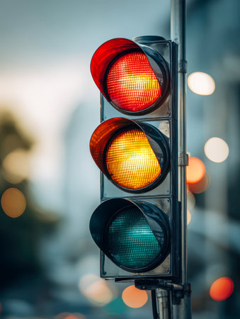 A vivid shot capturing the bright red and yellow lights of a signal against a softly blurred cityscape at dusk, evoking anticipation and urban rhythm.