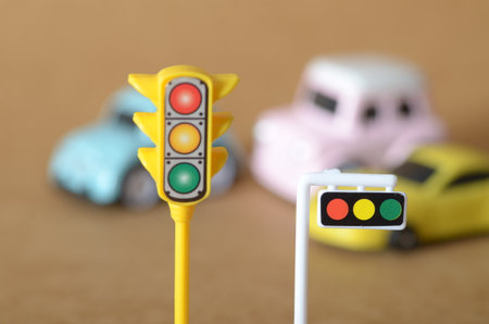 Traffic Signal Close-Up with Out-of-Focus Toy Vehicles – Transportation Concept