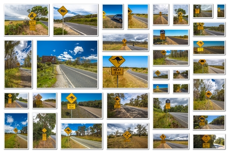 Australian road signs collage of kangaroo, koala, wombat, devil and penguin crossing road in Australian States of Victoria, New South Wales and Tasmania.