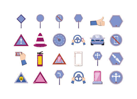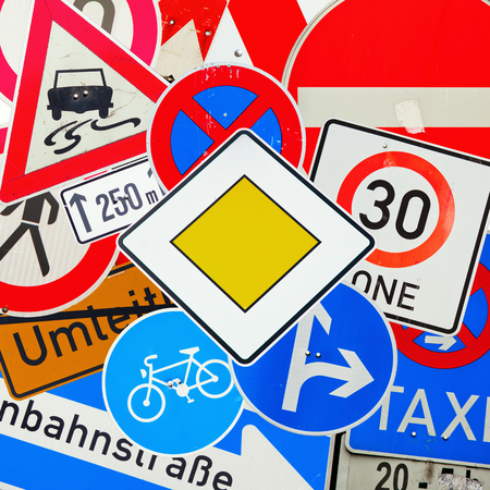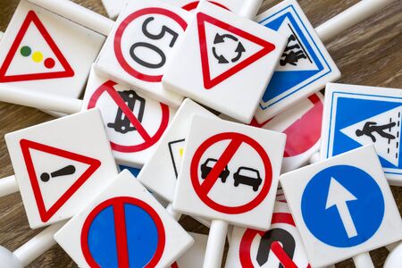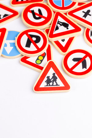 Traffic signs forming a collage on a light blue background, representing road rules, driver education, learning, and highway safety regulations for automobiles and transportation concepts