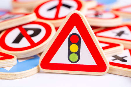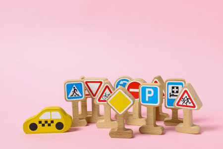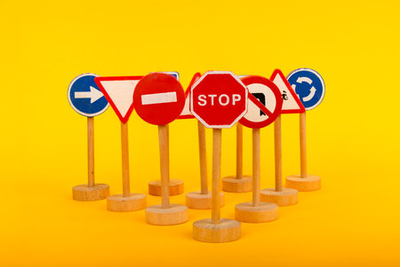Colorful wooden toy traffic signs are arranged against a bright yellow background, creating a playful and educational visual