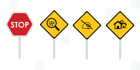 A vibrant arrangement of various traffic signs and safety symbols on a bright yellow background, perfect for urban planning and construction themes.