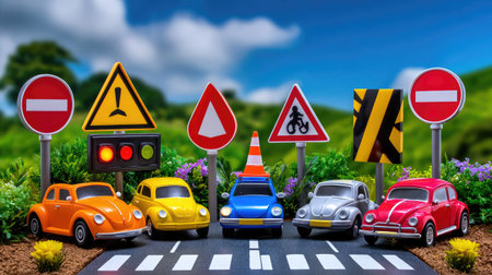 A vibrant arrangement of toy cars and traffic signs creates an engaging road scene. Ideal for illustrating play, safety, and childhood imagination in a creative setting.
