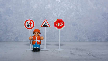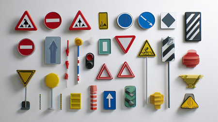 Collection road signs on white surface, traffic laws and regulations 3d background