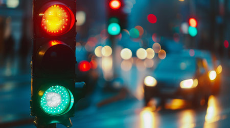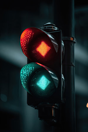 A detailed image of a traffic light shows both red and green illuminated signals. The composition focuses on the lights against a dark background, highlighting the contrast. The visual style features clear, modern aesthetics, and the image may be used in commercial projects or editorial content.
