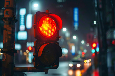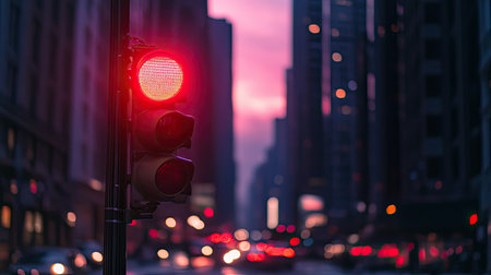 A vibrant red traffic light shines brightly in an urban setting, signaling vehicles to stop. The image captures the essence of city life during the evening, showcasing a safe and illuminated street environment.