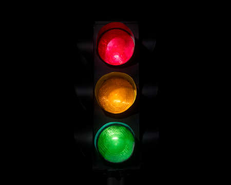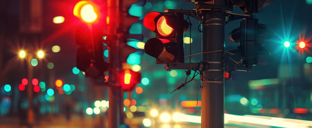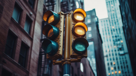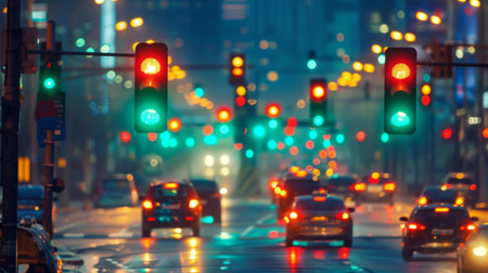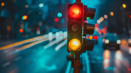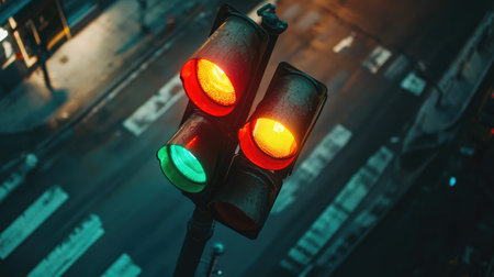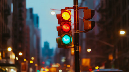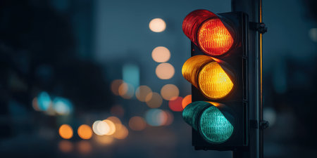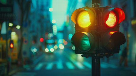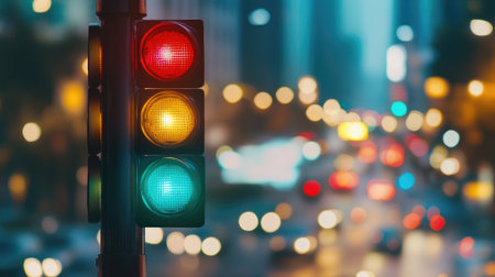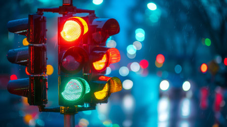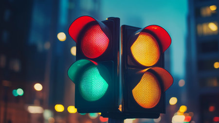 A close-up view presents a traffic signal displaying red, green, and yellow lights. The colors of the lights contrast against a blurred city background. The image exhibits high contrast and bokeh effects. Suitable for illustrating transportation, urban infrastructure, or safety concepts for various purposes.
