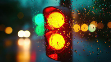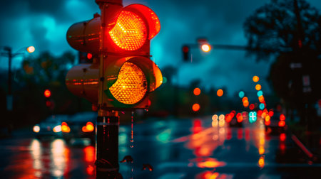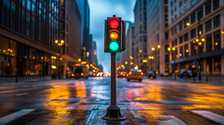 A vibrant traffic light stands alone on a slick, wet urban street, reflecting the glowing city lights in the evening rain. The scene captures urban life and traffic control.