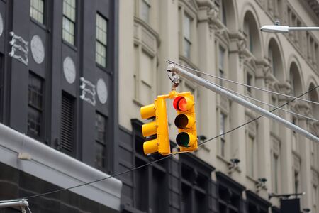 Yellow Traffic Light on background of skyscrapers, Manhattan, New York, USA. Red stop signal.