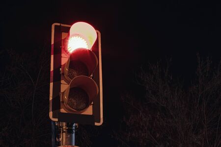 Urban traffic light glowing red in the night, other colors off, surrounded by black negative space, cinematic atmosphere