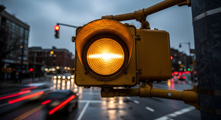 A yellow traffic light glows brightly on a city street during a gloomy evening, signaling caution. In the background, long exposure captures the light trails of moving cars on the wet pavement, creating a dynamic urban scene.