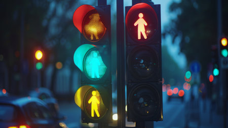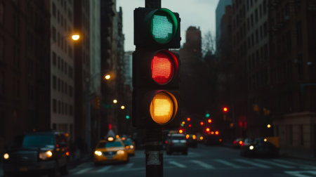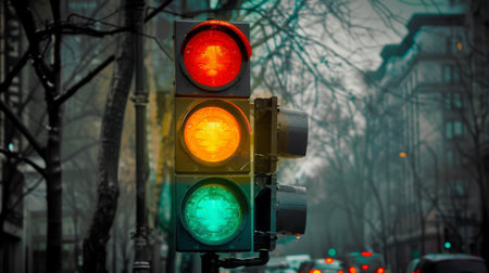 A vibrant urban traffic light displaying red, yellow, and green signals amidst a bustling city backdrop. A symbol of modern transportation and safety.