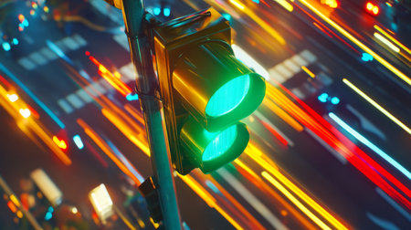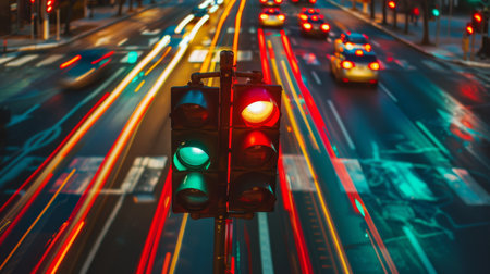 A vibrant urban scene featuring a traffic light at night, with red and green signals glowing amidst a backdrop of motion blur from passing vehicles.