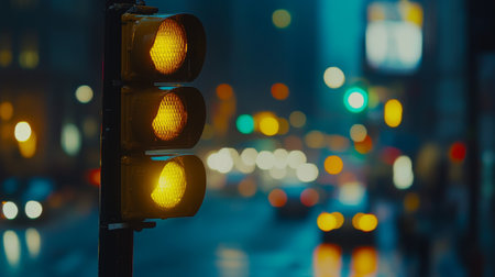 A traffic light in the evening showing the yellow light, with bokeh from distant streetlights and blurred traffic moving past, symbolizing waiting and anticipation