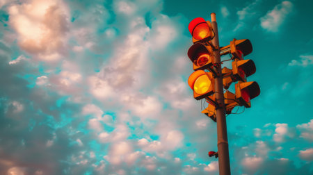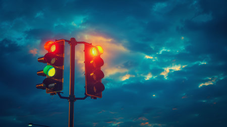 Captivating image of a traffic light against a dramatic sunset sky. The vibrant colors blend beautifully, creating an atmospheric landscape filled with emotion.
