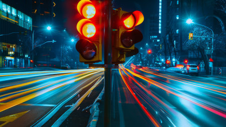 A traffic signal at night with streaks of light from passing vehicles, emphasizing urban traffic flow and safety.