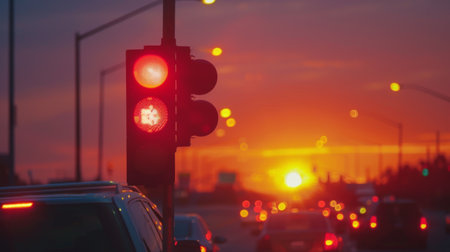 A traffic light at a busy intersection during sunset, with warm hues illuminating the scene.