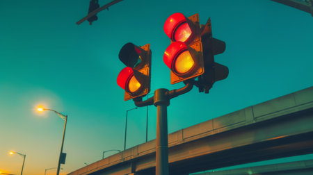 A traffic light suspended over a highway interchange, directing traffic flow and ensuring safety during peak travel times.