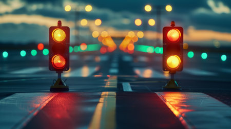 Close-up of traffic lights at an airport runway, guiding airplanes for takeoff and landing