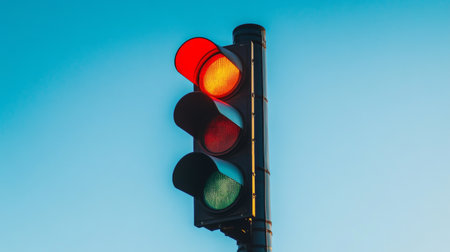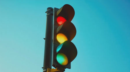 A vibrant traffic light displaying red, yellow, and green against a clear blue sky, symbolizing control and safety in urban environments. Ideal for transportation themes.