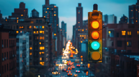 A dramatic shot of a traffic light changing from green to yellow, captured at dusk with city lights twinkling in the background, emphasizing urban movement