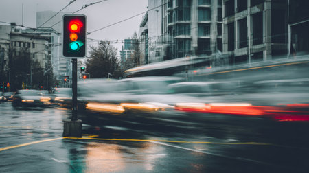 A dynamic urban traffic scene displays a green traffic light amidst a rainy setting. Motion blur captures the hustle and bustle of vehicles, evoking city life.