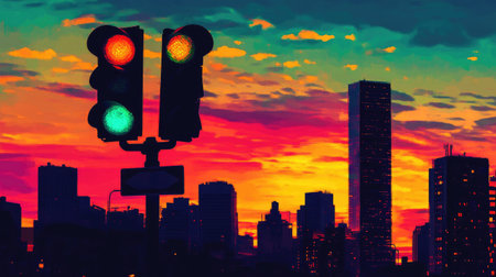 A dramatic shot of a traffic light silhouetted against a colorful sunset, emphasizing the transition from day to night in a vibrant cityscape