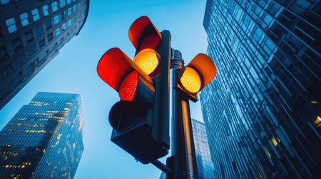 A vibrant traffic light stands prominently against a backdrop of modern skyscrapers during dusk, highlighting urban infrastructure and safety.