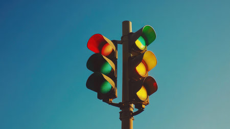 A vibrant traffic light featuring red, yellow, and green signals against a clear blue sky, symbolizing road safety and traffic control in urban environments.