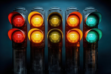 A charming image of a row of traffic lights on a busy street, showcasing their colorful signals and the rhythm of city life in motion