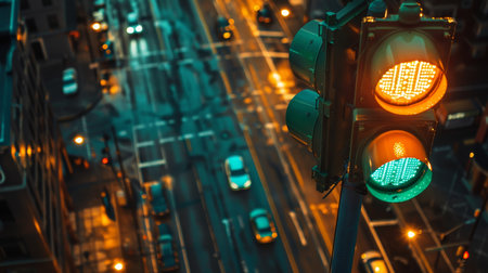 The image features a close-up view of a traffic light. The upper signal shows a green arrow, while the lower signal displays a yellow light. The composition emphasizes the contrast between dark and illuminated elements. The visual style and lighting are suitable for commercial projects related to transportation or safety.