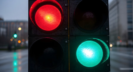 A detailed image of a traffic light shows both red and green illuminated signals. The composition focuses on the lights against a dark background, highlighting the contrast. The visual style features clear, modern aesthetics, and the image may be used in commercial projects or editorial content.